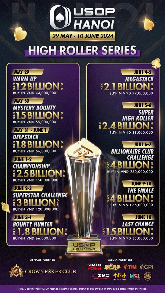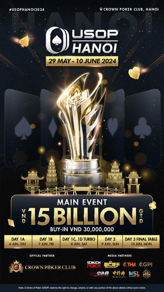 The much-anticipated U Series Of Poker (USOP) is set to make waves in Vietnam yet again, partnering with the esteemed Crown Poker Club again for a thrilling poker spectacle. The stage is set at the Crown Poker Club, where USOP Hanoi 2024 will kick off its poker extravaganza from the 29th of May to the 10th of June 2024. With a whopping VND 60 Billion in total guaranteed prize pools, this edition promises to be the most exciting in USOP history, attracting poker aficionados from across the globe.